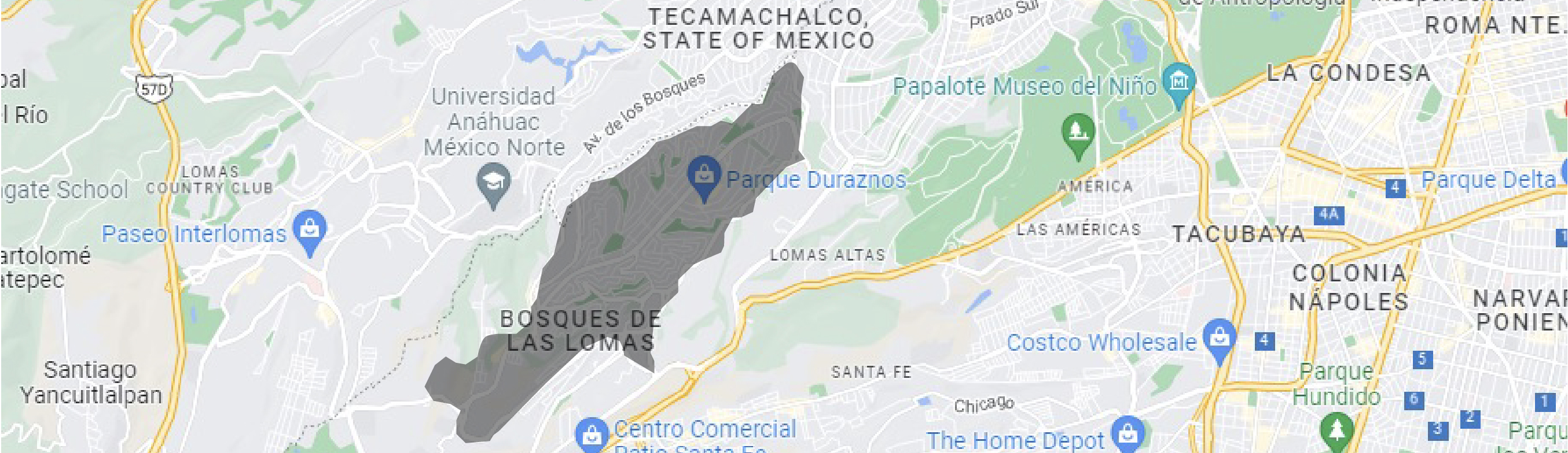 Estilo de vidaBosques de las Lomas es una tranquila para vivir. Es una zona muy familiar donde la vida transita entre el trabajo de los padres y el colegio de los hijos. Los fines de semana encontrarás familias enteras paseando mascotas, haciendo ejercicio y disfrutando de los centros comerciales que hay a la redonda.