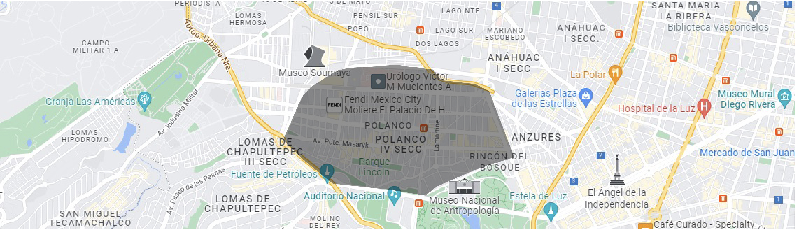 La zona de Polanco la comprenden las colonias Polanco Chapultepec y Polanco Reforma. Está situada en el norponiente de la CDMX en la alcaldía Miguel Hidalgo. Polanco es una de las colonias más tradicionales y cosmopolitas de la CDMX; incluso de todo México. Desde sus inicios fue planeada como una zona residencial y comercial aprovechando las tierras colindantes a la Hacienda de San Juan de los Morales que al día de hoy se mantiene como un restaurante emblemático de la zona.