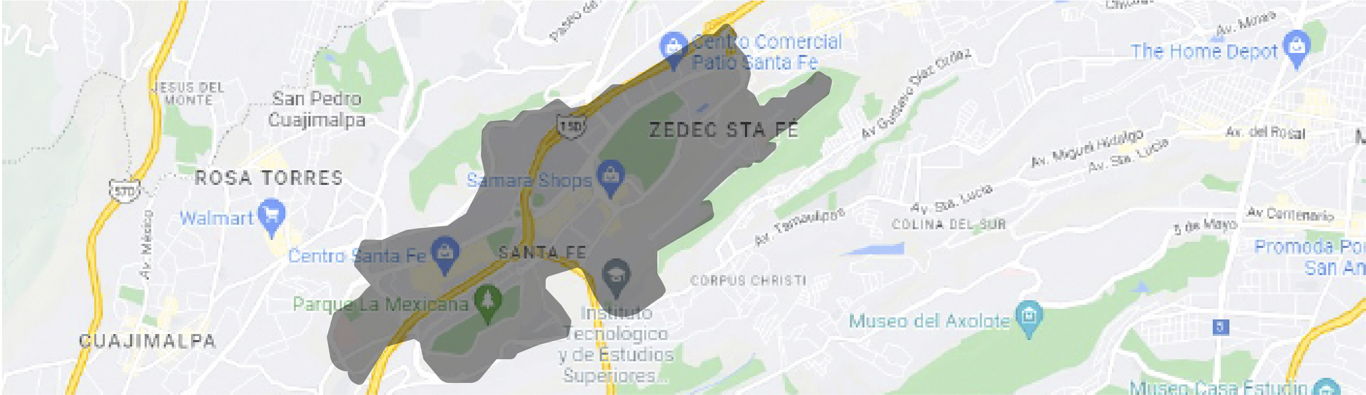 Santa Fe está ubicada al poniente de la Ciudad de México y es considerada la zona más moderna de la ciudad donde encontrarás grandes corporativos, centros comerciales, hoteles e instituciones educativas.